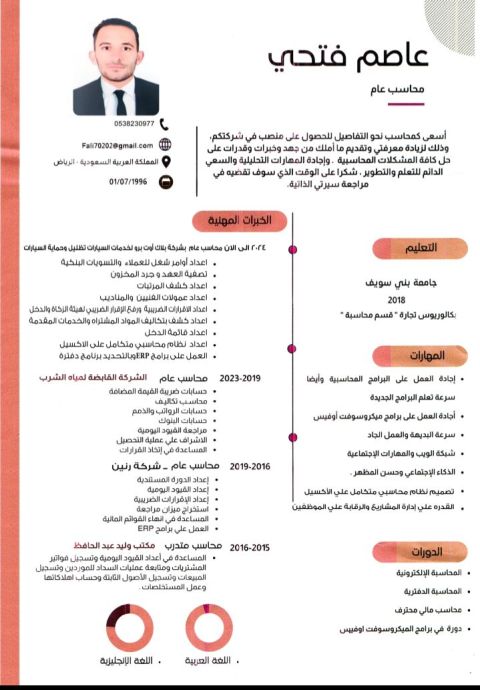محاسب مصري خبرة خمس سنوات في القطاع الحكومي والخاص في مصر وسنة ونصف بالمملكة بشركة عناية بالسيارات أبحث عن عمل رقم