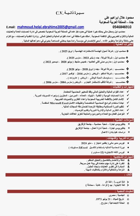 مدير مالي ومدير حسابات ماجستير محاسبة، لغة انجليزية، خبرة 10 سنوات عملت في قطاع المصانع، مقاولات، كافيهات، المطاعم، عمل القوائم الماليه والتحليل المالي لها والخبرة في البرامج المحاسبية ERP وفي اعداد الاقرارات الضريبية والزكوية، خبرة في تأسيس وإدارة قسم الحسابات لأي نشاط، وفي اعداد شجرة الحسابات والدورة المستندية