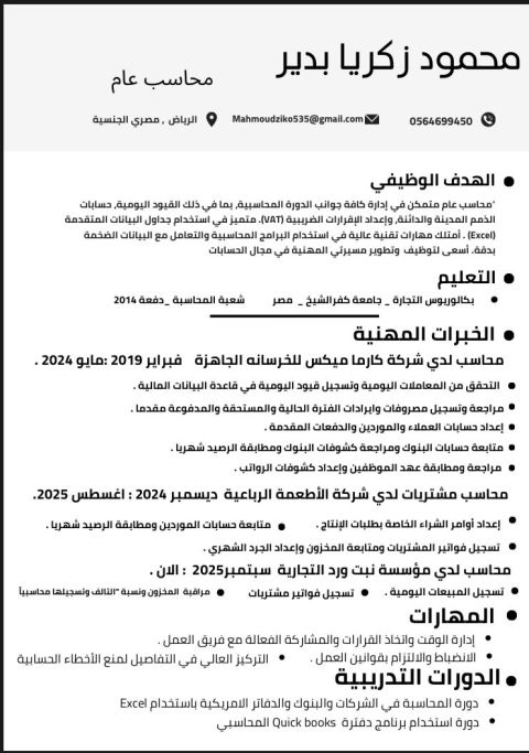 ابحث عن فرصة عمل كمحاسب (دوام كامل) امتلك خبرة عملية تمتد ل 4 سنوات في الإدارة المالية، مع خلفية أكاديمية قوية كخريج تجارة انجليزي. أبرز المهارات والخبرات إدارة الدورة المحاسبية كاملة واعداد القيود اليومية. خبرة في التعامل مع نظام Odoo ERP (المخازن، المشتريات، والمبيعات) اجادة لبرنامج. Excel. word) لاعداد التقارير المالية. التعامل مع ضريبة القيمة المضافة واعداد الاقرار الضريبي. التسويات البنكية