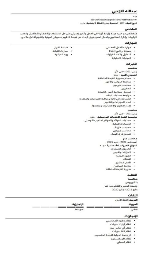 مدير حسابات بخبرة تتجاوز 11 عاما في السعودية، متمكن من الاشراف على الحسابات واعداد القوائم المالية والختامية وفقا للمعايير الدولية مهارات قوية في الرقابة المالية، وإدارة التدفقات النقدية وتحسين كفاءة الأنظمة المحاسبية، لدي خبرة عملية في رفع الاقرارات الضريبية والزكوية والتعامل مع الفحص الزكوي والضريبي والاعتراضات. خبرة في رفع القوائم عبر برنامج قوائم والاشراف على المراجعة واعتمادها من مراجع خارجي