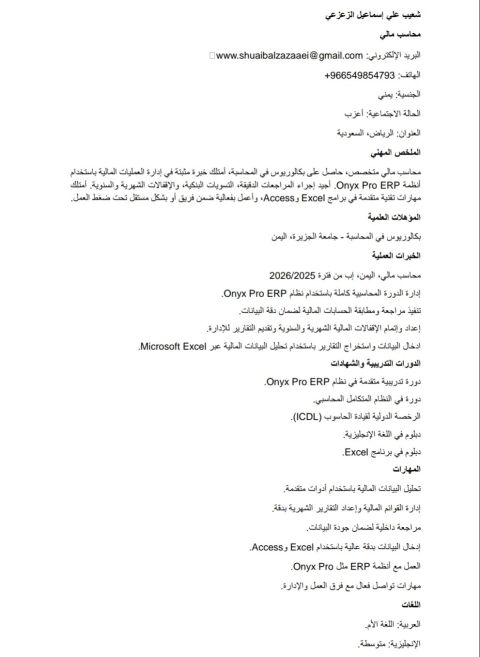 محاسب خبرة تتجاوز خمس سنوات في المحاسبة العامة وقطاع المقاولات، أجيد استخدام الأنظمة المحاسبية وبرامج الأوفيس. خبرة في القيود اليومية، اعداد التقارير المالية، التسويات البنكية، مسيرات الرواتب، تسوية عهد الموظفين، ومحاسبة المشاريع، اضافة لاعداد اقرارات ضريبة القيمة المضافة (VAT) عضو في الهيئة السعودية للمراجعين والمحاسبين (SOCPA) دقيق ومنظم واعمل بكفاءة تحت الضغط - جاهز للعمل فورا - الرياض