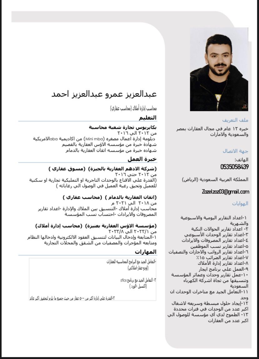 ابحث عن عمل محاسب تطوير عقاري موجود بالخبر الدمام الخبرات الأخرى 1 - مشتريات 2 اشراف 3 - القدرة علي العمل بترميمات الوحدات وتسليمها علي المفتاح يعني اذا العقار محتاج صيانة كامل بشرف عليه مع مشترياته وعمالة وبسلمه في أقرب وقت للمستأجر بالاضافة الى كتابة العقود الالكترونية ومتابعه شركة الكهرباء والمياه بالاضافة الى التحصيل والتسويق موجود معي سيارة وساكن بالخبر الشماليه