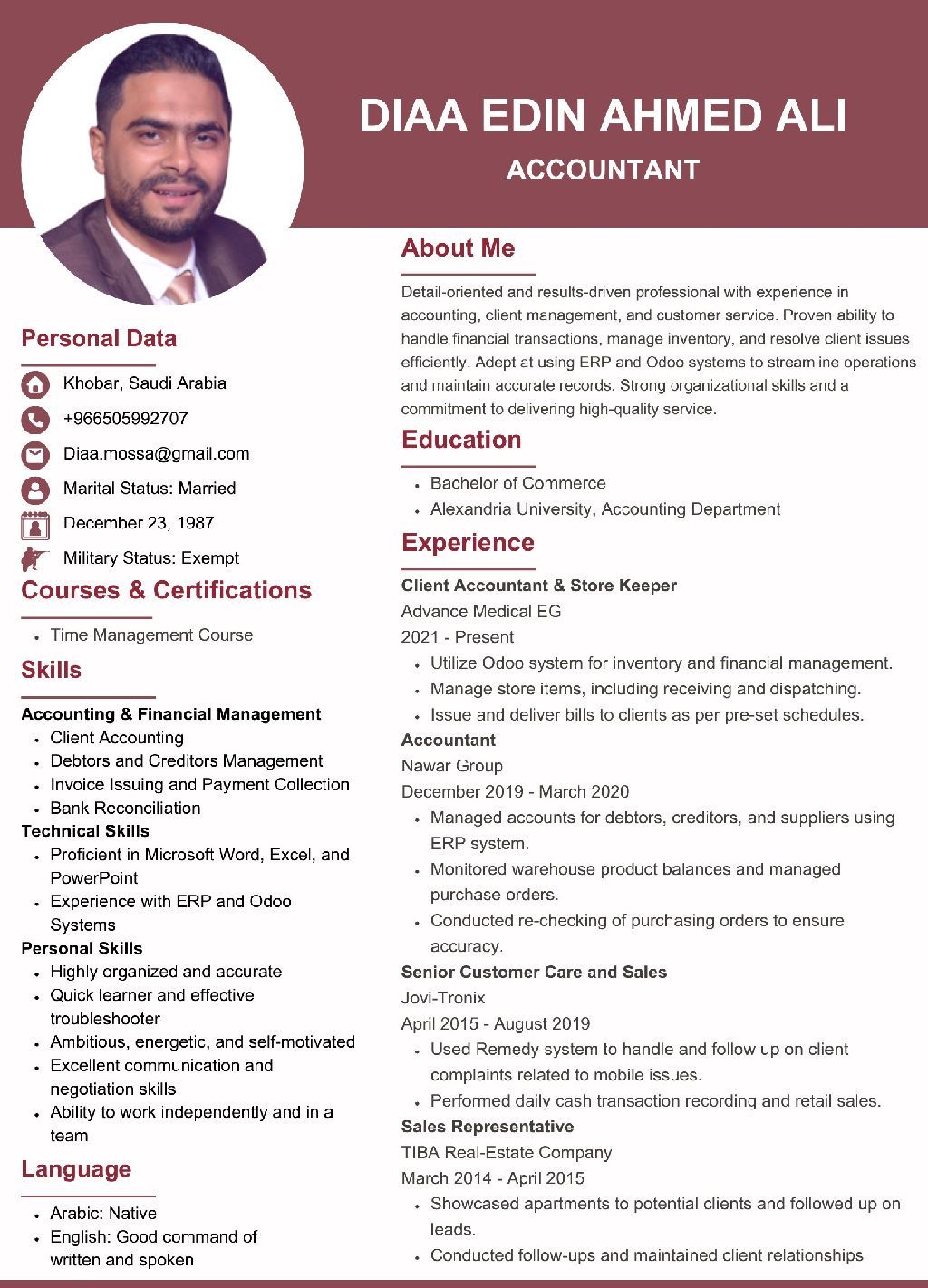 محاسب عملاء وأمين مخزن بخبرة تزيد عن 4 سنوات في إدارة حسابات ومتابعة حركة العملاء والمخزون وتسجيل العمليات المالية، ومراجعة أوامر البيع، ومطابقة أرصدة العملاء، بالاضافة الى متابعة حركة الأصناف داخل المخزن وضمان دقة الجرد الدوري. لدي خبرة في استخدام برامج المحاسبة وإدارة المخزون مثل odoo، أتميز بالدقة العالية، والعمل تحت الضغط. متواجد في المنطقة الشرقية مدينة الخبر إقامة قابلة للنقل