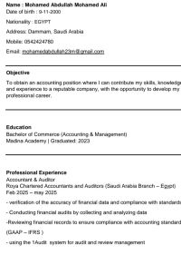 أنا محاسب مصري موجود في الدمام خريج 2023 عندي معرفة جيدة بالمحاسبة المالية ومايكروسوفت أوفيس خاصة أكسيل خبرة متوسطة ببرنامج odoo erp