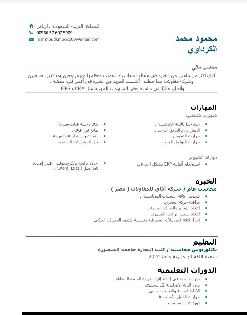 الاسم محمود محمد، خبرة عامان في المحاسبة، أجيد برامج Microsoft مثل (Excel, word) عندي خبرة في برامج ERP