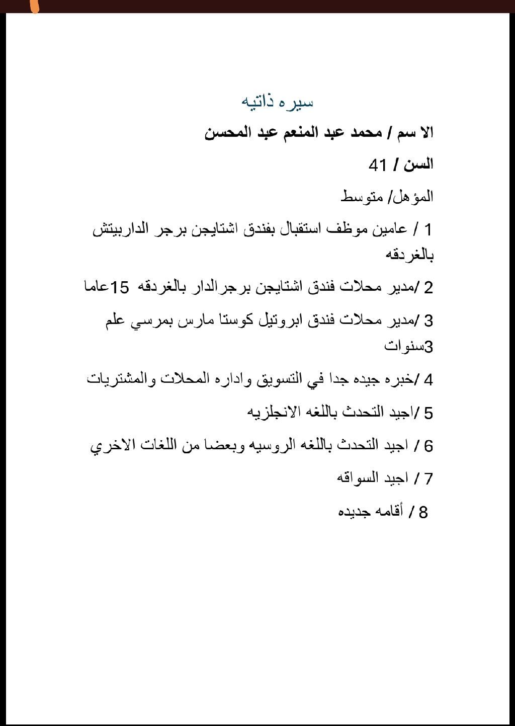 الاسم/ محمد عبد الله المنعم عبد المحسن عبد الحليم السن / 41 المؤهل/ متوسط العمل / عامين موظف استقبال بفندق اشتايجن برجر الدار بيتش الغردقة العمل / مدير محلات فندق اشتايجن برجر الدار بيتش الغردقة 15 عاما العمل مدير محلات فندق ابر وتيل كوستا مارس مرسى علم 3 سنوات خبرة جيدة جدا في التسويق وإدارة المحلات والمشتريات أجيد التحدث باللغة الانجليزية والروسية وبعضا من اللغات الأخرى أجيد السواقة