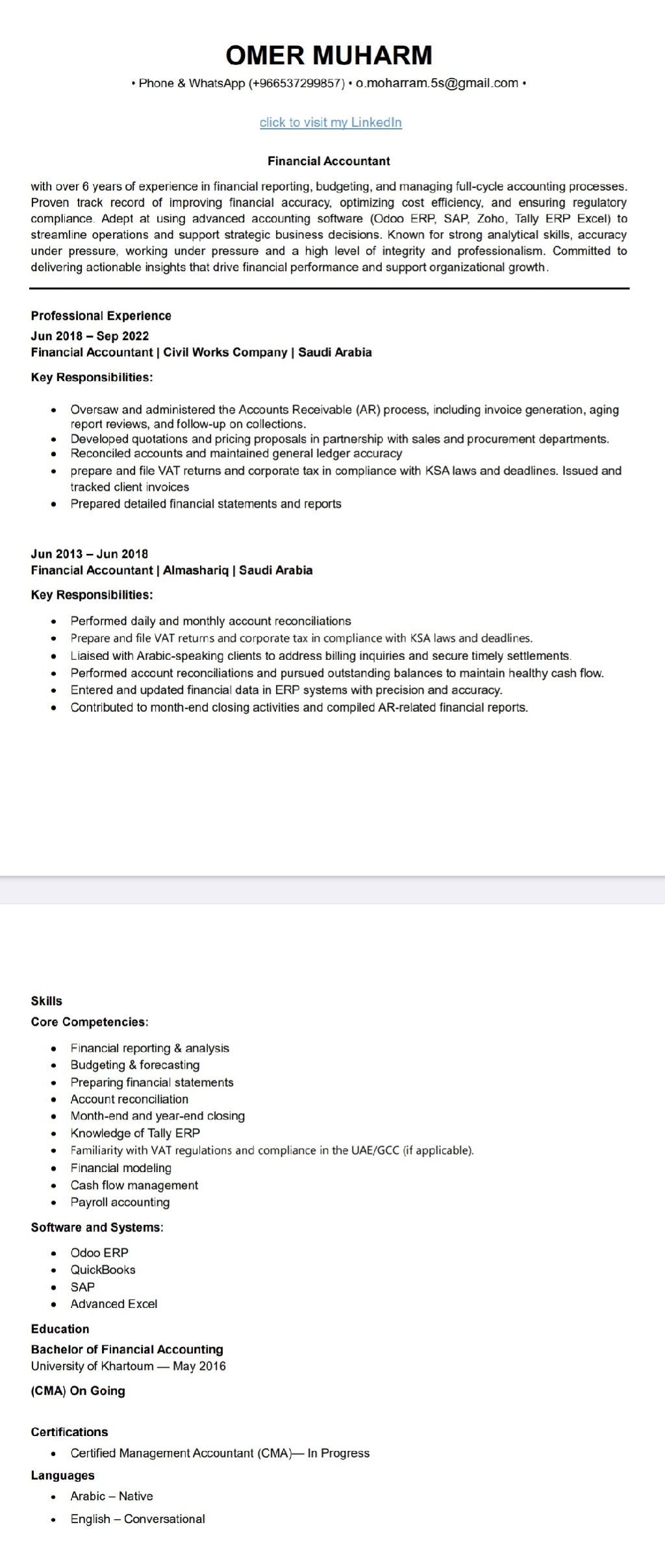 I am an accountant, bachelor's degree in financial accounting with 6 years of experience in financial reporting, preparing financial statements, journal entries, accounts receivable, accounts payable, tax report, Odoo ERP, SAP, Zoho, Tally and doso