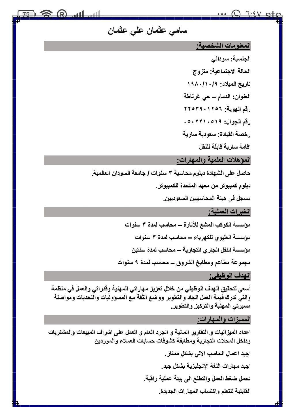 الدمام - حي غرناطة محاسب الإقامة سارية قابلة للنقل مسجل في هيئة المحاسبين السعودين
