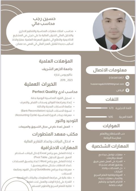 محاسب ومحلل مالي متمرس إقامة قابلة للنقل متاح فوريا. ابحث عن فرصة جديدة في المملكة العربية السعودية أنا محاسب ومحلل مالي محترف امتلك خبرة أكثر من 4 سنوات في مجال الاستشارات المالية والادارية ابحث حاليا عن فرصة جديدة للانضمام الى فريق ديناميكي حيث يمكنني المساهمة بمهاراتي وخبراتي في المحاسبة المالية والتحليل المالي متمكن في أل Excel, PowerPoint, word, outlook, ولغة انجليزية جيدة جدا، نظام Zoho