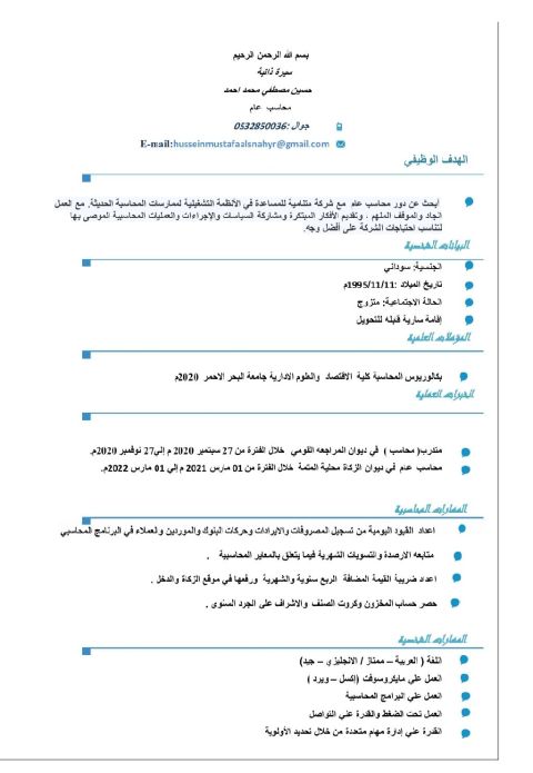 حسين مصطفى محمد سوداني الجنسية حاصل على بكالوريوس المحاسبه اعداد قيود اليوميه واصدار فواتير المشتريات والمبيعات ومتابعة الموردين والعملاء ومطابقة الحسابات البنكية وخبرة في رفع الاقرار الضريبي