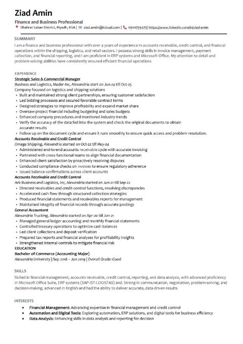 Accountant with one year of experience in Saudi Arabia, proficient in ERP accounting software, SMACC, and Microsoft Office (Excel and Word) Experience includes entering purchase invoices, issuing sales invoices, generating monthly financial reports, recording VAT and Zakat, settling advances, entering journal entries, reconciling customer and supplier accounts, bank reconciliations, and preparing