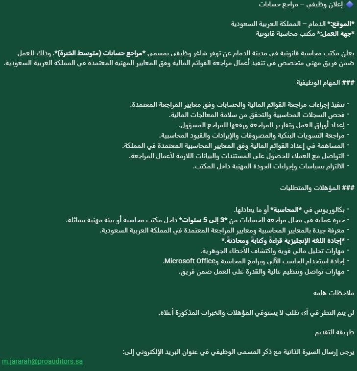مطلوب للعمل في الدمام - حي الشاطئ - المؤهلات والمتطلبات بكالوريوس في المحاسبة أو ما يعادلها خبرة عملية في مجال مراجعة الحسابات من 3 الى 5 سنوات داخل مكتب محاسبة أو بيئة مهنية مماثلة معرفة جيدة بالمعايير المحاسبية ومعايير المراجعة المعتمدة في المملكة العربية السعودية اجادة اللغة الانجليزية قراءة وكتابة ومحادثة مهارات تحليل مالي قوية واكتشاف الأخطاء الجوهرية اجادة استخدام الحاسب الآلي وبرامج المحاسبة