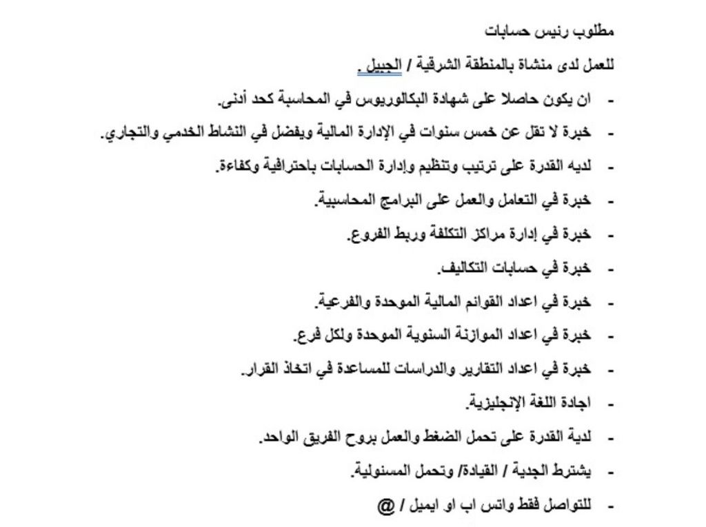 مطلوب رئيس حسابات أو مدير مالي للعمل لدى منشأة في المنطقة الشرقية / الجبيل - يكون حاصلا على شهادة البكالوريوس في المحاسبة كحد أدنى - خبرة لا تقل عن خمس سنوات في الإدارة المالية ويفضل في النشاط الخدمي والتجاري - لديه القدرة على ترتيب وتنظيم وإدارة الحسابات باحترافية وكفاءة - خبرة في التعامل والعمل على البرامج المحاسبية - خبرة في إدارة مراكز التكلفة وربط الفروع - خبرة في حسابات التكاليف - خبرة في اعداد القوائم