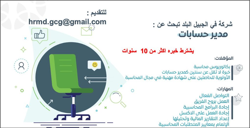 نبحث عن رئيس حسابات بخبرة 10 سنوات فما فوق. خبرة في المقاولات والفنادق منطقة العمل الشرقية الجبيل - حي طيبة للتقديم