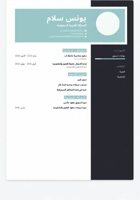 الاسم يونس علي محمد علي التخصص محاسبة، إدارة، تسويق الخبرة سنة تسويق. سنة مبيعات سنة ونصف في ادارة فروع والمخزون. 6 أشهر محاسب (كاشير) المؤهلات بكالوريوس في المحاسبة - بكالوريوس في الإدارة دبلوم في التسويق - خبرة في المبيعات المهارات إدارة الحسابات - تحليل البيانات المالية تسويق الكتروني - مهارات التواصل الخبرة العمل هائل سعيد انعم مدير مبيعات. ونائب مدير قسم