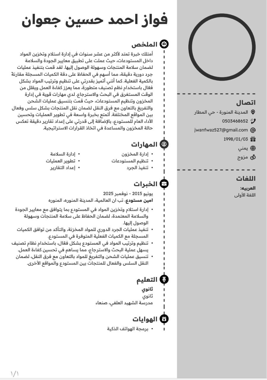 أرغب بالعمل مشرف مستودعات خبرة لأنقل عن عشر سنوات كما موضح في أل CV للتواصل واتساب أو اتصال