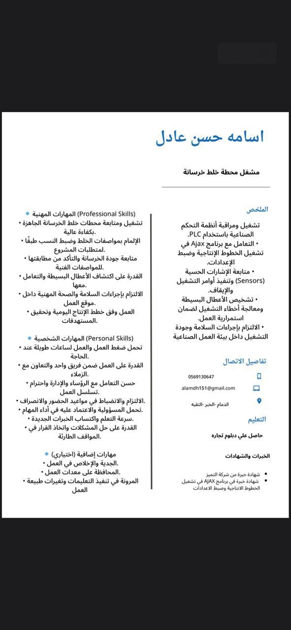 تشغيل ومراقبة أنظمة التحكم الصناعية باستخدام PLC. التعامل مع برنامج Ajax في تشغيل الخطوط الانتاجية وضبط الاعدادات. متابعة الاشارات الحسية (Sensors) وتنفيذ أوامر التشغيل والايقاف. تشخيص الأعطال البسيطة ومعالجة أخطاء التشغيل لضمان استمرارية العمل. الالتزام باجراءات السلامة وجودة التشغيل داخل بيئة العمل الصناعية
