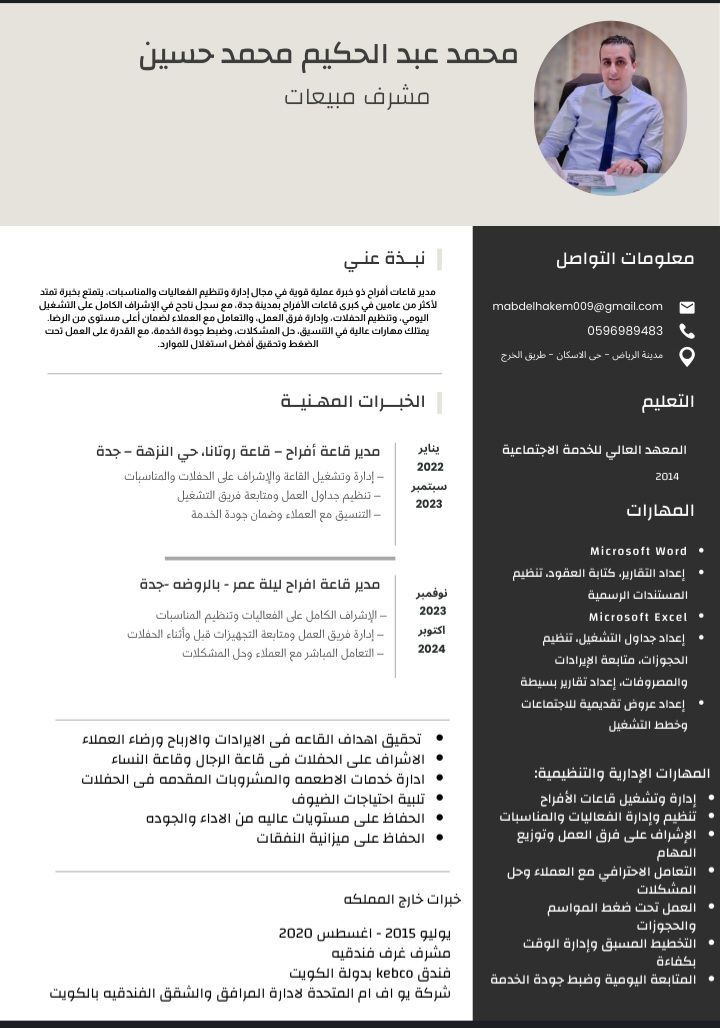 الاسم محمد عبد الحكيم الخبرة مدير قاعة أفراح / إدارة وتشغيل المكان الدمام - السعودية