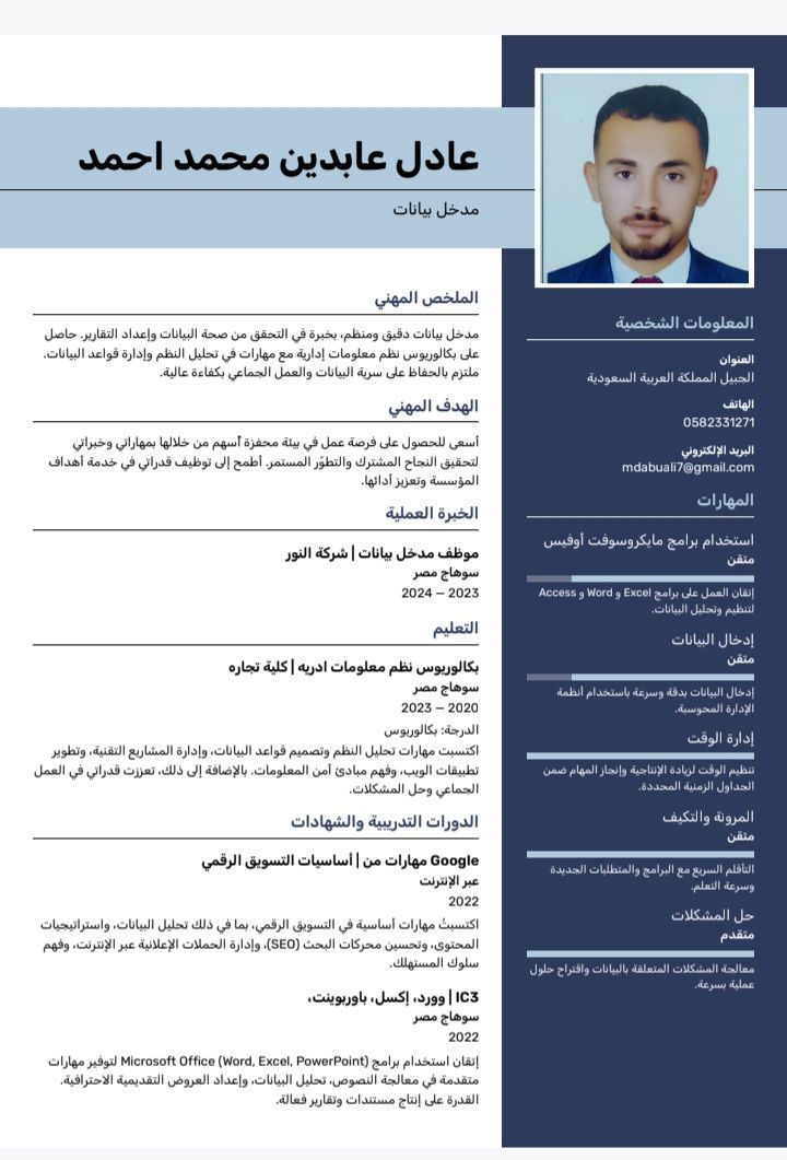 مدخل بيانات ذو كفاءة عالية، يتمتع بمهارات متقدمة في استخدام برامج مايكروسوفت أوفيس وادخال البيانات بدقة وسرعة. حاصل على بكالوريوس نظم معلومات، مع خبرة في تحليل البيانات وحل المشكلات. ملتزم بالعمل تحت الضغط وتقديم نتائج عالية الجودة