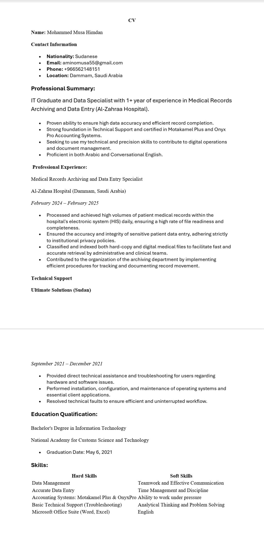 محمد الأمين سوداني الجنسية خريج تقنية معلومات (IT) لدي خبرة عملية في ادخال البيانات وأرشفة الملفات الطبية، مع معرفة جيدة بأنظمة السجلات الطبية والعمل المكتبي المنظم. أتميز بالدقة، الالتزام، والقدرة على التعامل مع البيانات الحساسة بسرية عالية. لدي أساس قوي في ادخال البيانات (Data Entry) أرشفة وتنظيم الملفات الطبية استخدام الحاسب الآلي وبرامج الأوفيس أساسيات قواعد البيانات وSQL مفاهيم الشبكات (أدرس