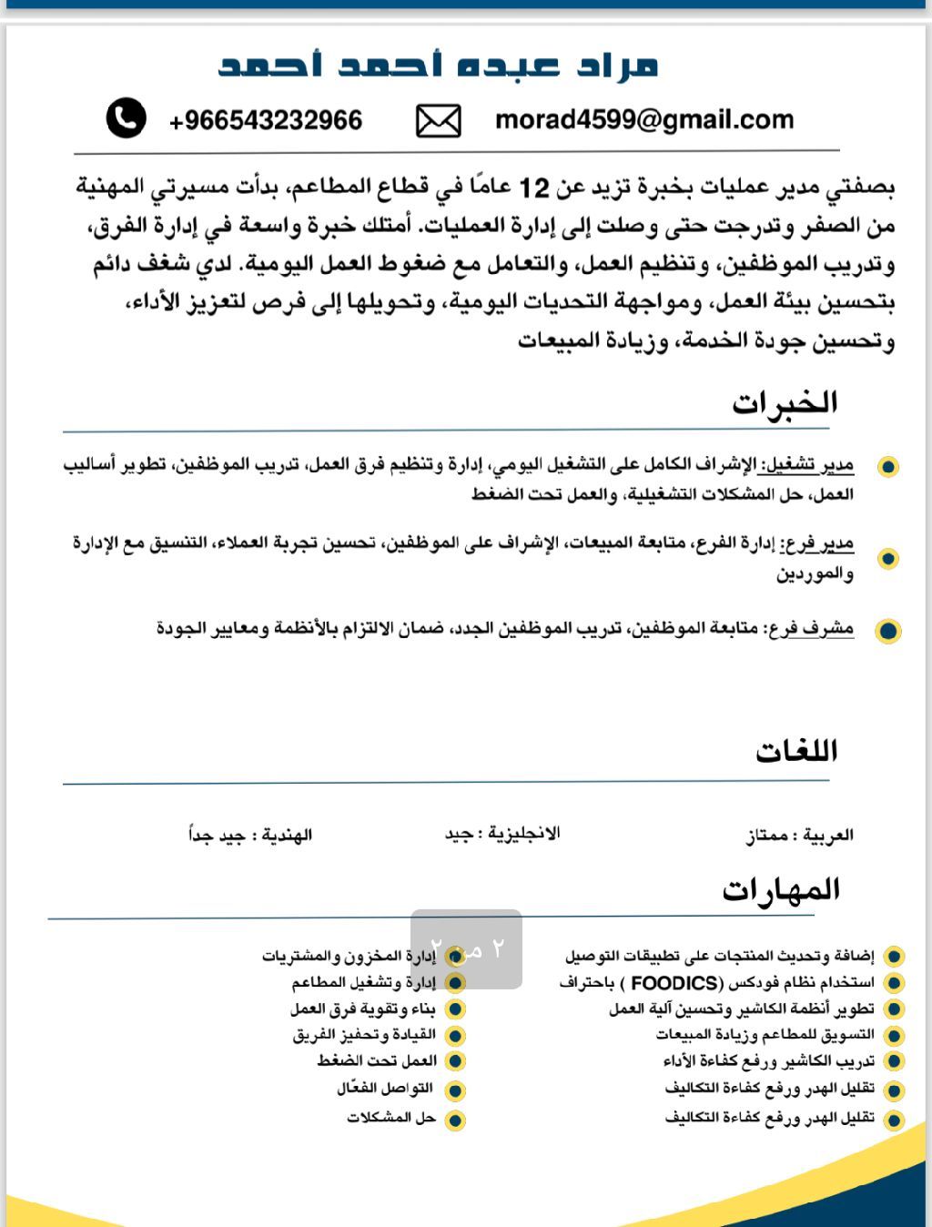 مدير تشغيل يبحث عن عمل يتشرف بالانضمام الى فريق متكامل ادارة ورفع مستوى المبيعات وعمل دراسات وجدوله للمطاعم والكوفي خبرات عديدة للتواصل على الرقم المهارات فالصورة