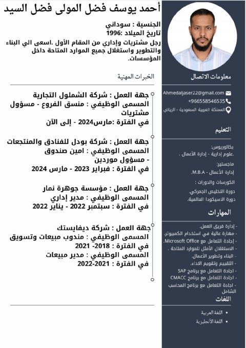 أحمد يوسف سوداني الجنسية درسة إدارة أعمال ولدي ماجستير في إدارة الأعمال أجيد التعامل مع الحاسب الآلي وبرامج الا وفس والبرامج المحاسبية خبرة في مجال المشتريات والمخازن وجميع الوظائف الادارية لدي اقامة سارية وقابلة للنقل العمر 30 سنة