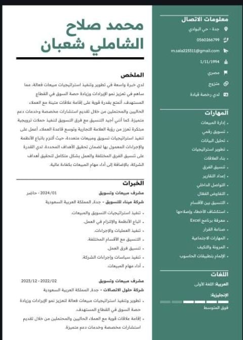 شهاب صالح رحم أني تونسي الجنسية مقيم في السعودية خبرة في مجال ادارة المبيعات وخدمة العملاء وادارة وتشغيل الفنادق والمجال الاداري بصفه عامة السكرتارية 10 سنوات داخل المملكة ودول الخليج البحرين قطر الامارات ابحث عن عمل في المجالات سابقة الذكر حاصل على دورات تدريبية في مهارات البيع والتسويق ومهارات ادارة العلاقات ومهارات التفاوض وأيضا حاصل على شهادة الحاسب ملم بالسوق الخليجي في عدة مجالات
