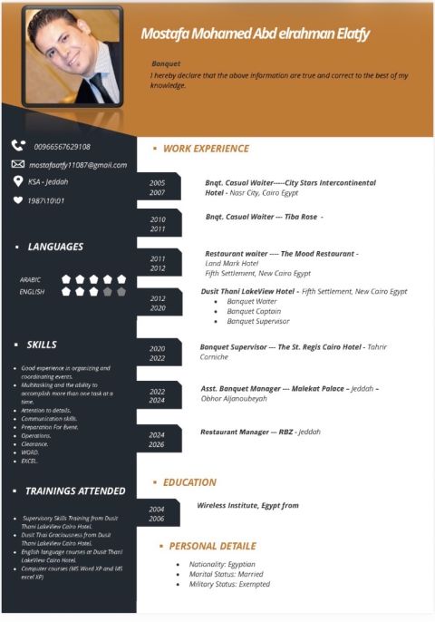 لو محتاج مدير مطعم أو مدير حفلات ما تتردد في الاتصال بي
