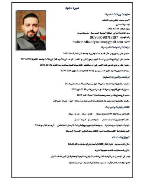 خريج نظم معلومات ادارية سوداني الجنسية إقامة سارية ابحث عن عمل لدي معرفة جيدة بالمبادئ الادارية والمحاسبية ولغة انجليزية وكيفية سير العمل الاداري واتقان استخدام الحاسب الآلي والبرامج الادارية والمحاسبية وكيفية الاشراف علي سير العمل والموظفين (عمل سابق في hunger station) أسعى لبدء مسيرتي المهنية في المجال الاداري والمحاسبة والمساهمة في تطوير العمل الاداري داخل المؤسسات. السيرة كاملة في الصورة)