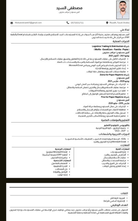 منسق اداري لدي خبرة في الأعمال المكتبية مثل ادخال البيانات، ترتيب الملفات، ومتابعة المهام اليومية. متمكن استخدام Excel في اعداد الجداول والتقارير والتعامل مع البيانات، ولدي معرفة في انشاء تقارير مبسطة باستخدام Power BI. أتعامل بشكل ممتاز مع الكمبيوتر وبرامج Office، لغتي الانجليزية جيدة جدا، وأتميز بالالتزام وسرعة التعلم. مقيم في مكة، سوداني مواليد السعودية إقامة قابلة للنقل، وجاهز للمباشرة فورا