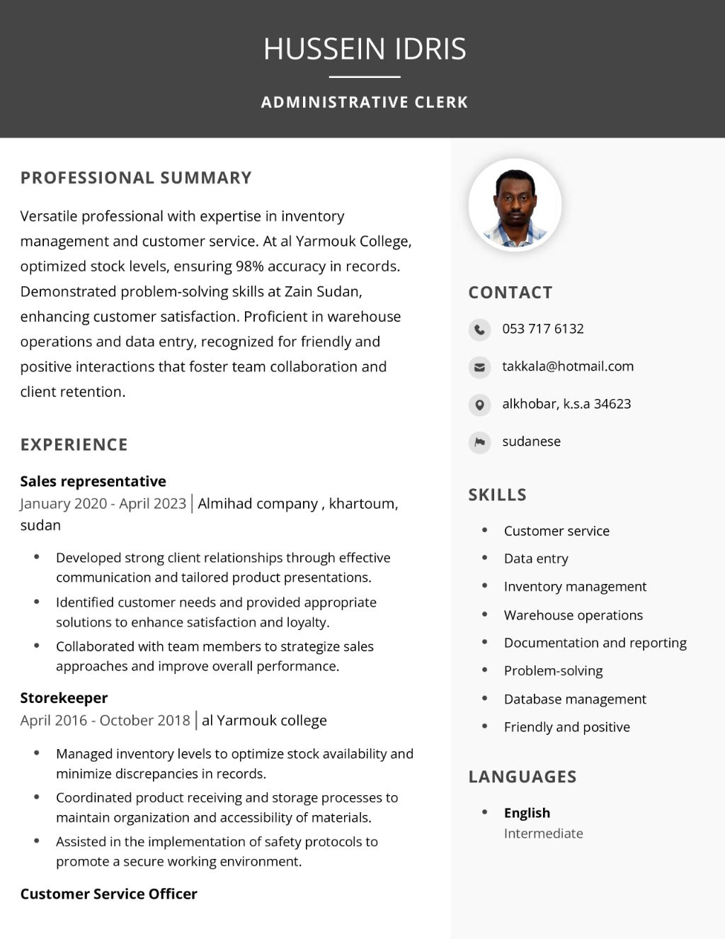 I am Hussein Idris is an Administrative Clerk with solid experience in customer service, inventory management, and warehouse operations. He has worked with Almihad Company, Al Yarmouk College, and Zain Sudan. Key achievements include Maintaining and accuracy in inventory records. Enhancing customer satisfaction through effective problemsolving. Building strong client relationships and supporting