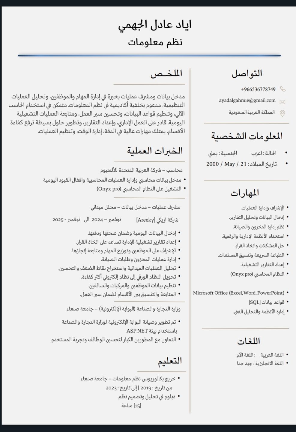 ابحث عن عمل ولدي خبرة ومؤهلات في الشركات اللوجستية النقليات لمدة سنة ومن ضمنها تتبع المركبات تنظيم سير العمل وجدولة السائقين لديهم، وأيضا لدي الخبرة من الناحية التقنية والادارية مثل مهارات الحاسوب والالمام بالنظام المحاسبي Onyx pro