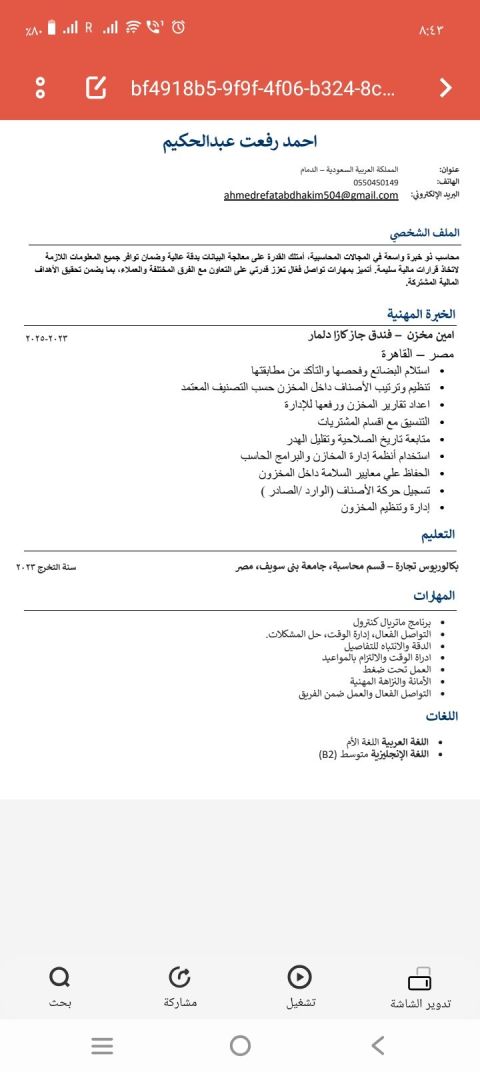 أنا أحمد مصري موجود في الرياض محاسب حديث التخرج واشتغلت في مكتب تأجير سيارات ابحث عن عمل بقالي فترة أرجو المساعده لو أحد قدامه وظيفة