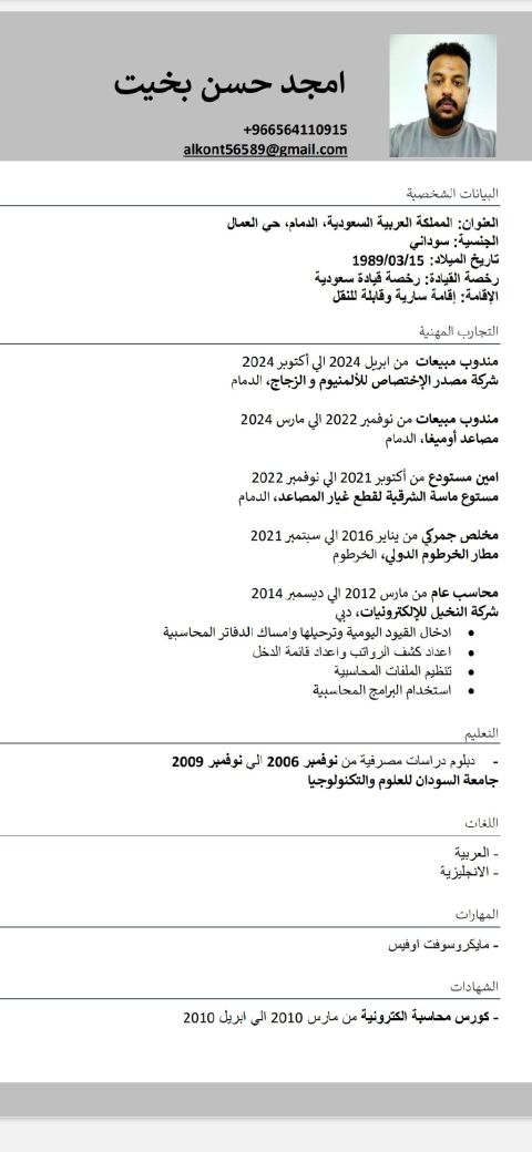 علي خضر سوداني 29 سنة إقامة سارية رخصة سارية أجيد التعامل مع الحاسوب وسرعة في ادخال البيانات وضغط العمل دوام كامل المؤهل جامعي عملت أمين مستودع شركة مقاولات وبائع قطع غيار سيارات ومحاسب كاشير ومشرف عمال ومندوب توصيل طرود وموظف استقبال جاهز إن شاء الله في أي وقت وأي مكان اتصال