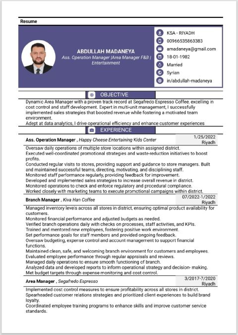 Resident in Riyadh, more than 12 years experience in operate branch or several branches of coffee shops, and operating kids Entertaining center include (restaurant, coffee, playground, and party halls) good skills in consumption and production control, customer service, team training, inventory, purchasing, and all excel reports