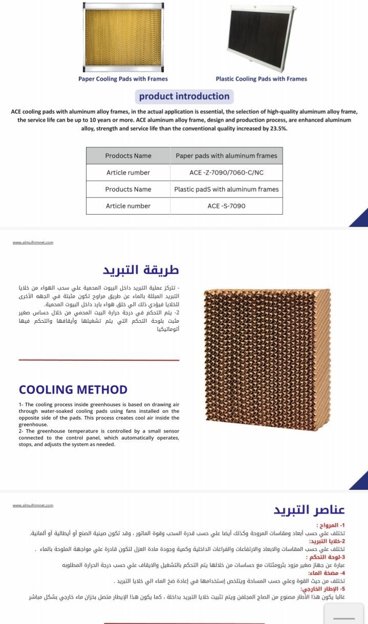 نحن شركة تعمل في مجال التبريد والتدفئة ونوفر أيضا خلايا تبريد مزارع الدواجن والبيوت المحمية خامات متينه بدون رائحة متواجدين في أنحاء المملكة