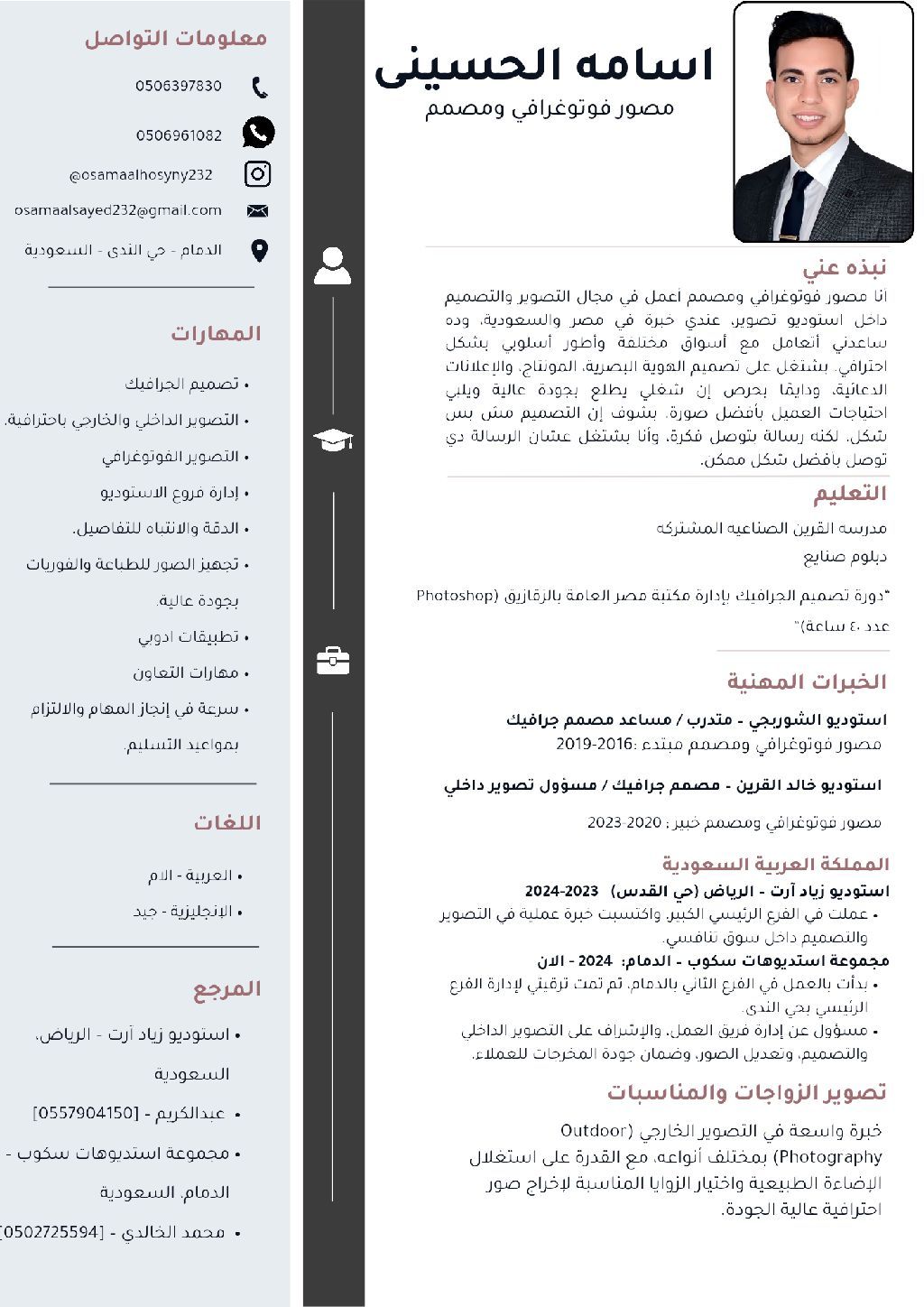 مصور فوتوغرافي ابحث عن عمل داخل استوديو تصوير، لدي خبرة 10 سنوات في العمل داخل الاستوديوهات، مع اتقان كامل لبرنامج Photoshop وتنفيذ أعمال التعديل والمعالجة الاحترافية للصور. للتواصل