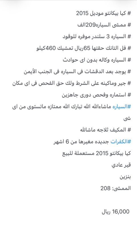 Car specifications: 1500cc engine, 4 cylinders, CVT automatic transmission, front-wheel drive, smart start, electronic brake, 16-inch alloy wheels, chrome grille, LED rear signals, fog lights, remote control, screen, fabric seats, power windows, power mirrors, Bluetooth, cruise control, trip meter, USB port, power outlet, manual air conditioning, center armrest, ABS brakes, electronic stability control, 2 tire pressure sensors, 5 seat belts. Contact / Reda