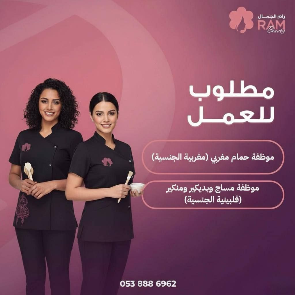 Ram Al - Jamal Beauty salon in Dhahran announces its need to fill the following vacancies Moroccan Bath Specialist (Moroccan nationality required) Massage, Pedicure & Manicure Specialist (Filipino nationality required) Location Dhahran - Al Qusour District - Prince Ahmed Street Contact