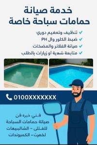 اعمل في مجال صيانة المسابح ومعالجة المياه الجوفية ومعالجه المياه من الطحالب والبكتريا وضبط نسب الكلور وph وجعل مياه المسبح صافية تمام بدون أي مشاكل با أعلى جودة وبأفضل سعر اعمل بنظام المتابعة الشهرية أوبا الزيارات على حسب طلب العميل