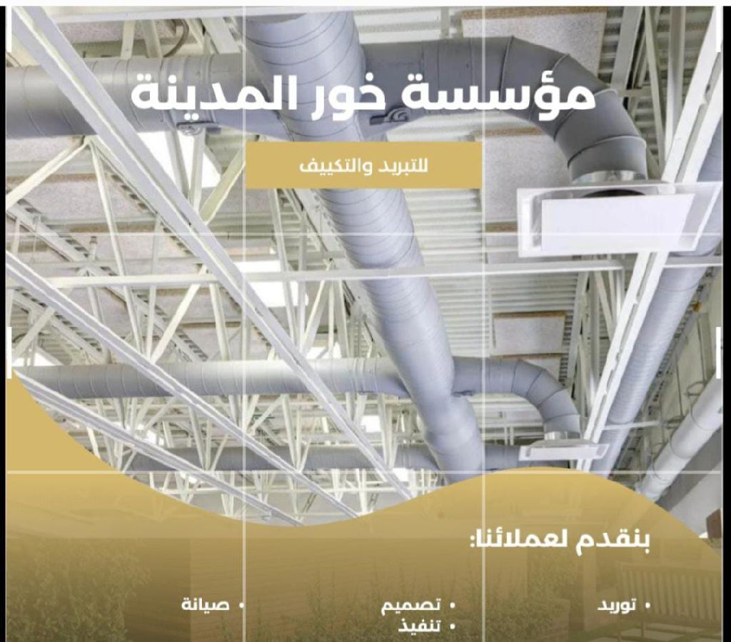 مؤسسة خور المدينة للتبريد والتكيف عمل تصاميم ومخططات المشاريع وتنفيذها. توريد وتركيب الدكت (مجاري الهواء) بأعلى المواصفات. توريد وتركيب الجريلات (مخارج الهواء) ذات الجودة العالية. تصنيع وتركيب جميع مجاري الهواء الدكت والروند دكت الدائري أفضل الأسعار سرعة التنفيذ أيدي ماهرة تحت اشراف مهندس أسعار خاصة بالمشاريع. جامعات / مدارس / قصور / فلل / كافيهات / مطاعم / فنادق / أبراج