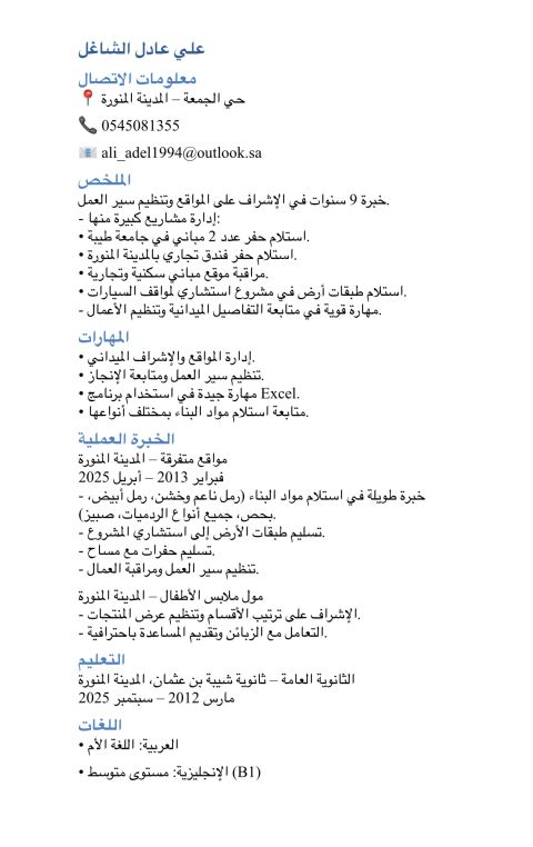 باحث عن فرصة عمل في مجال الصحة والسلامة المهنية، حاصل على بكالوريوس إدارة أعمال وشهادة الصحة والسلامة المهنية (OSHA) لدي مهارات في تقييم المخاطر، متابعة اجراءات السلامة، واعداد التقارير. ملتزم بالعمل بروح الفريق وتحسين بيئة العمل. جاهز للعمل فورا