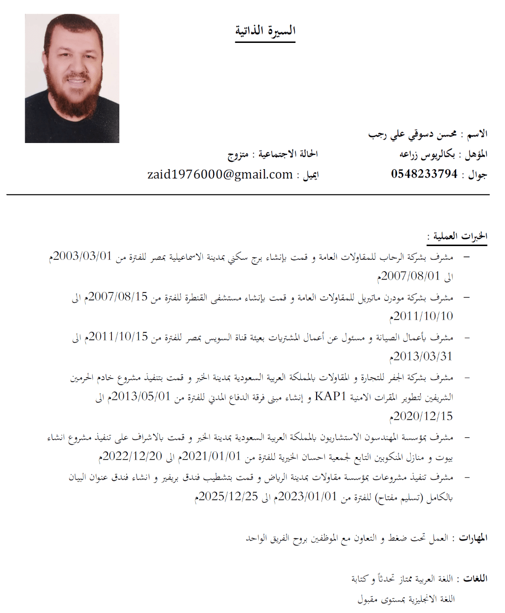 أنا شاب مصري ابحث عن عمل في أعمال تنفيذ المقاولات الانشاءات جوال 0548233794 الخبرات العملية مشرف بشركة الرحاب للمقاولات العامة وقمت بانشاء برج سكني بمدينة الاسماعيلية في مصر للفترة من 01032003م الى 01082007م - مشرف بشركة مودرن ماتيريل للمقاولات العامة وقمت بانشاء مستشفى القنطرة للفترة من 15082007م الى 10102011م - مشرف بأعمال الصيانة ومسؤول عن أعمال المشتريات