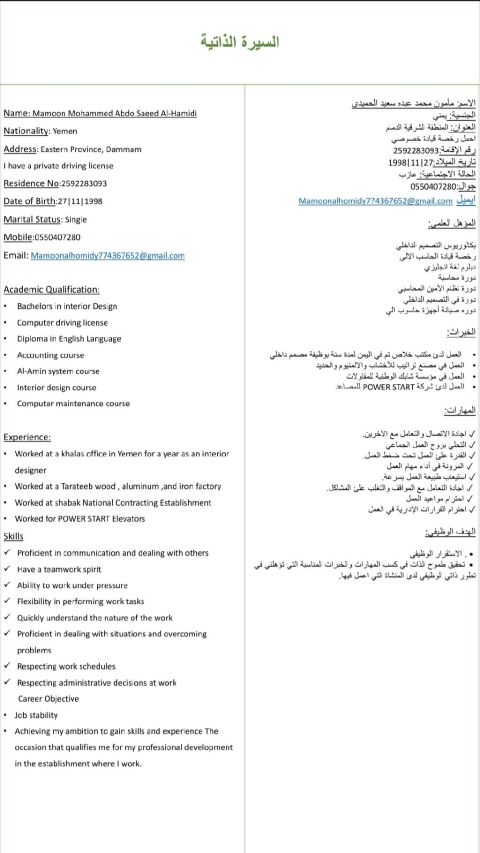 مصمم داخلي ومشرف مواقع خبرة سنتين عندي رخصة قيادة أجيد استخدام البرامج الهندسية مشرف ممتاز أجيد تركيب الشيب ورد والجبسون بورد وبديل الخشب وبديل الرخام مصمم ومنفذ لأعمال الديكورات