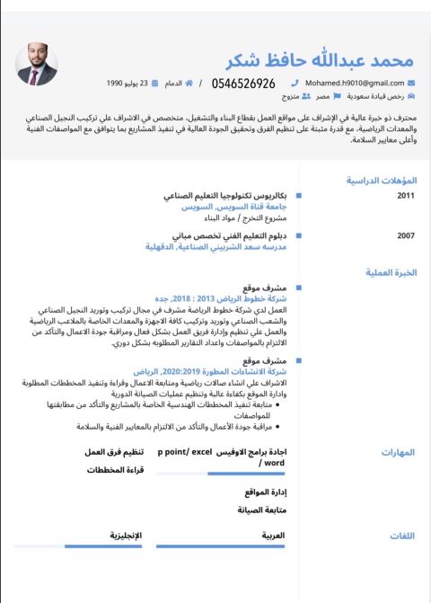 مشرف في مجال المقاولات العامة. خرسانات. تشطيبات. بنية تحتية. أعمال صناعية مائيه. ومشرف حركة توزيع. ومتابعة أفراد وعمال