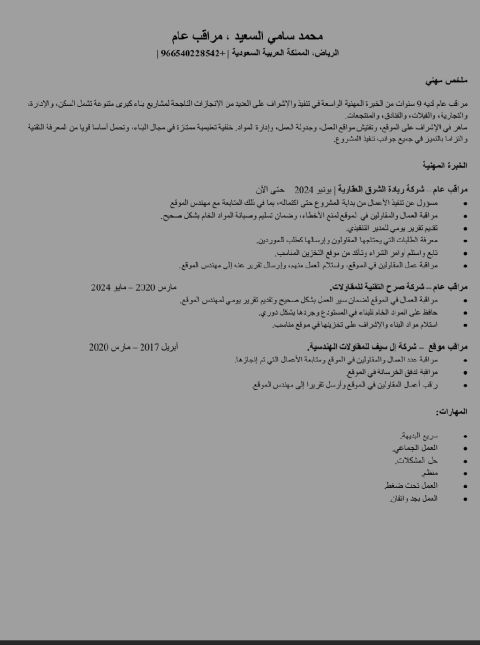 مشرف موقع حاصل على شهادة دبلوم تقني بعد الثانوية هندسة مدنية خبرة 17 سنة في الاشراف الهندسي وحساب الكميات في التطوير العقاري وخبرة في الاشراف على مشاريع التراث العمراني في المملكة واعداد التقارير اليومية والأسبوعية والشهرية حاصل على الاعتماد المهني للهيئة السعودية للمهندسين