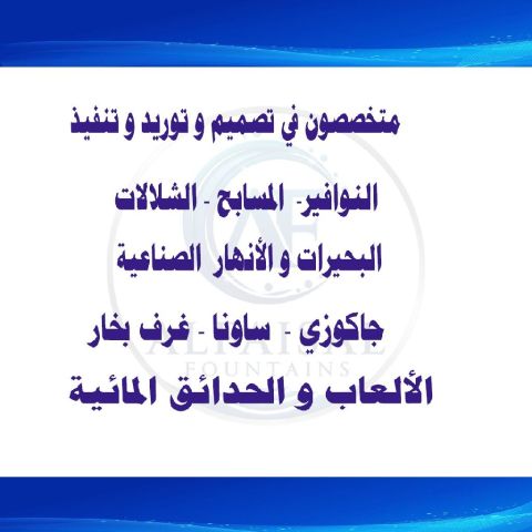 متخصصون في تصميم وتوريد وتنفيذ مشاريع النوافير والمسابح والشلالات والأندية الصحية (جاكوزي. ساونا. غرف بخار) والأنهار والبحيرات الصناعية والألعاب والحدائق المائية