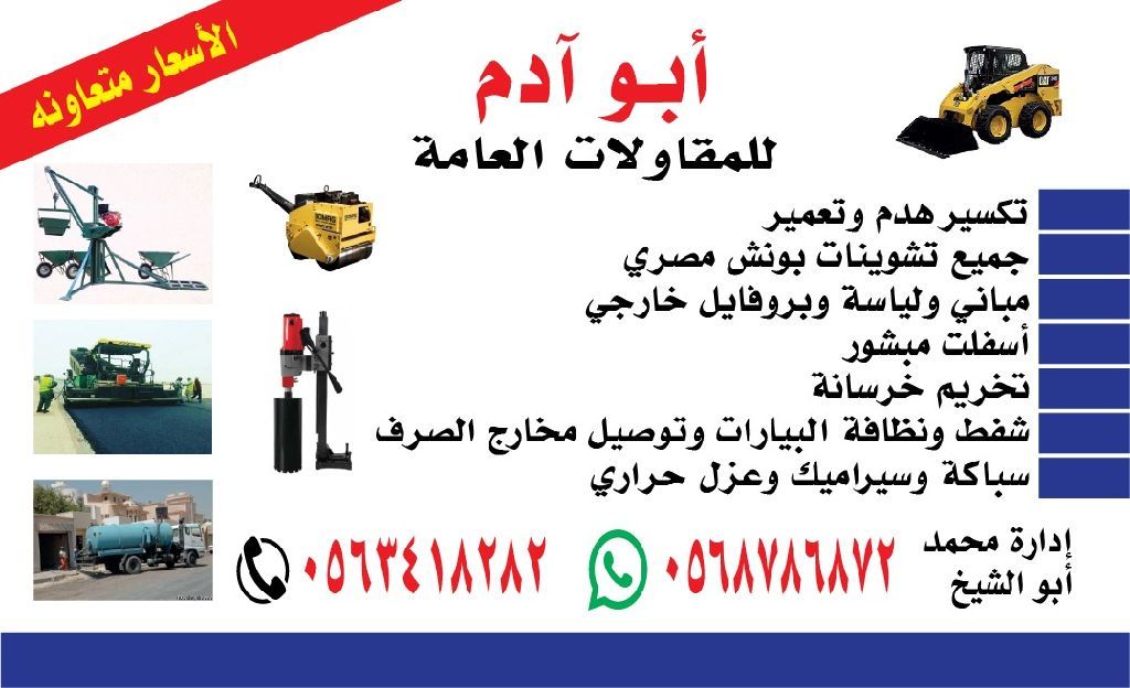 Abu Adam General Contracting Demolition, Reconstruction, and Building. All construction work with Egyptian cranes. Buildings, plastering, and exterior profiles. Asphalt paving. Septic tank pumping and cleaning, and drainage outlet connections. Plumbing and tiling. Competitive prices