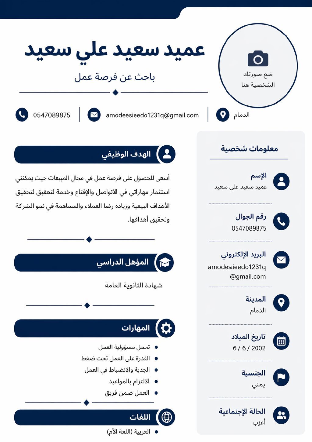 أسعى للحصول على فرصة عمل في مجال المبيعات حيث يمكنني استثمار مهاراتي في التواصل والاقناع وخدمة العميل لتحقيق الأهداف البيعية وزيادة رضا العملاء والمساهمة في نمو الشركة والعمل لتحقيق الأهداف