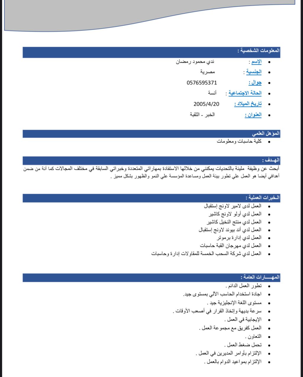 أنا من سكان الخبر خبرة في الكاشير اشتغلت في لاونجات أنا زيارة